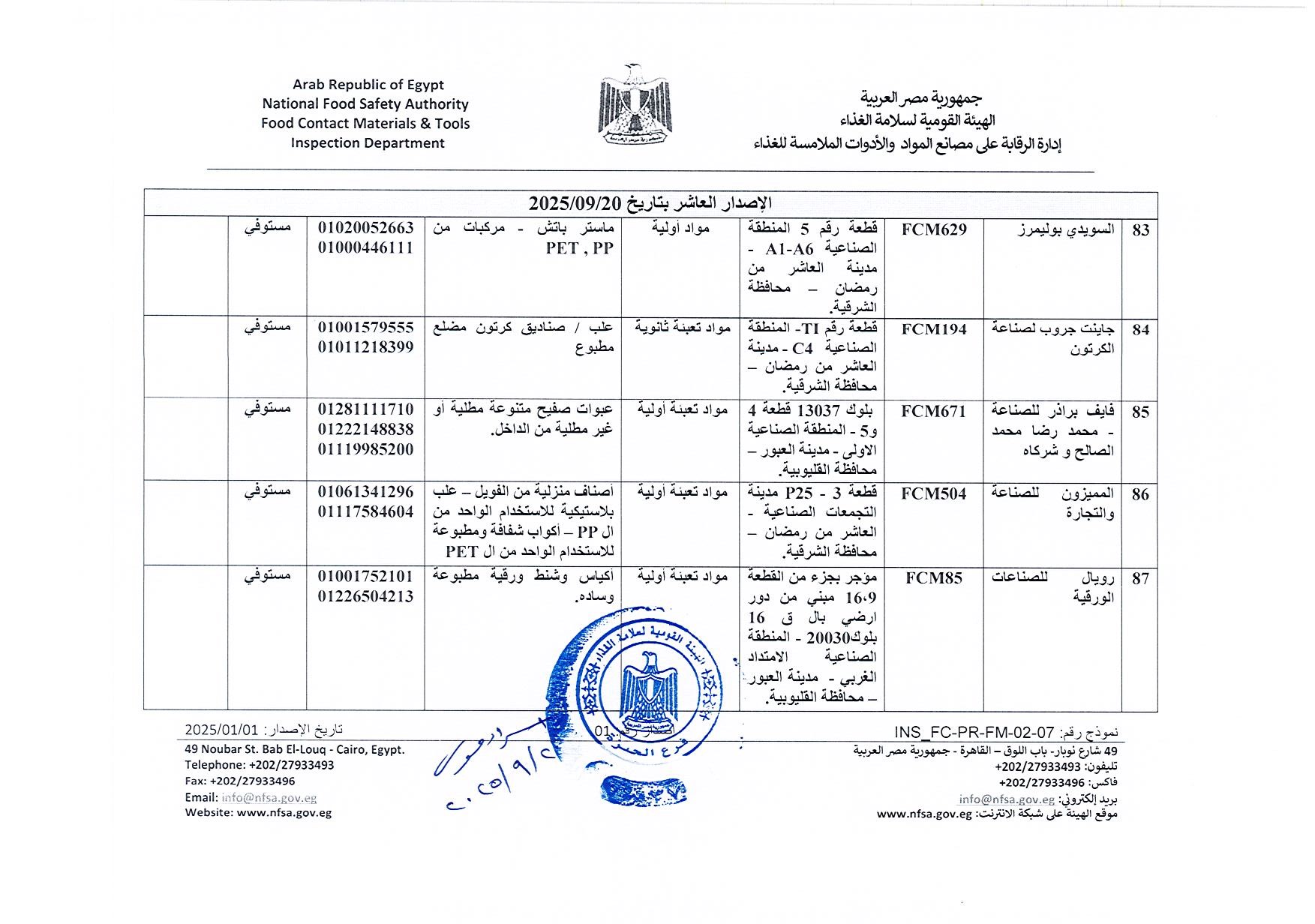 الشهادة : التسجيل ف القائمة البيضاء للهيئة القومية لسلامة الغذاء NFSA