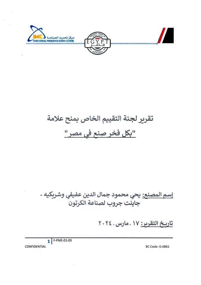 كما نُعبر عن فخرنا بحمل علامة "بكل فخر صنع في مصر"، التي تؤكد على الجودة الاستثنائية والتميز في منتجاتنا المصنعة محليًا. تعكس هذه الشهادات والمزايا التزامنا بالجودة والابتكار، مما يعزز مكانتنا كشركة رائدة في صناعة الكرتون المضلع، ويؤكد ثقة عملائنا وشركائنا في منتجاتنا وخدماتنا.