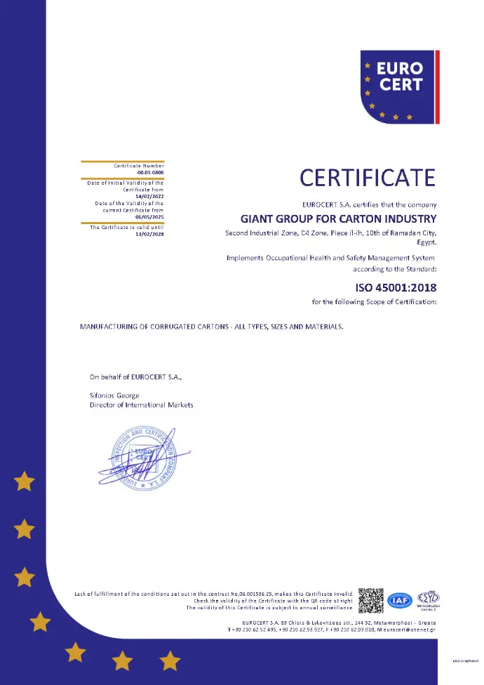 بكل فخر، تُبرز شركة جاينت جروب لصناعة الكرتون المضلع التزامها الثابت بمعايير الجودة العالمية. حصلت شركتنا على ثلاث شهادات أيزو عالمية، معتمدة من الجهات المانحة المرموقة، تؤكد التزامنا بأعلى معايير الجودة والإدارة. هذه الشهادات تشمل: